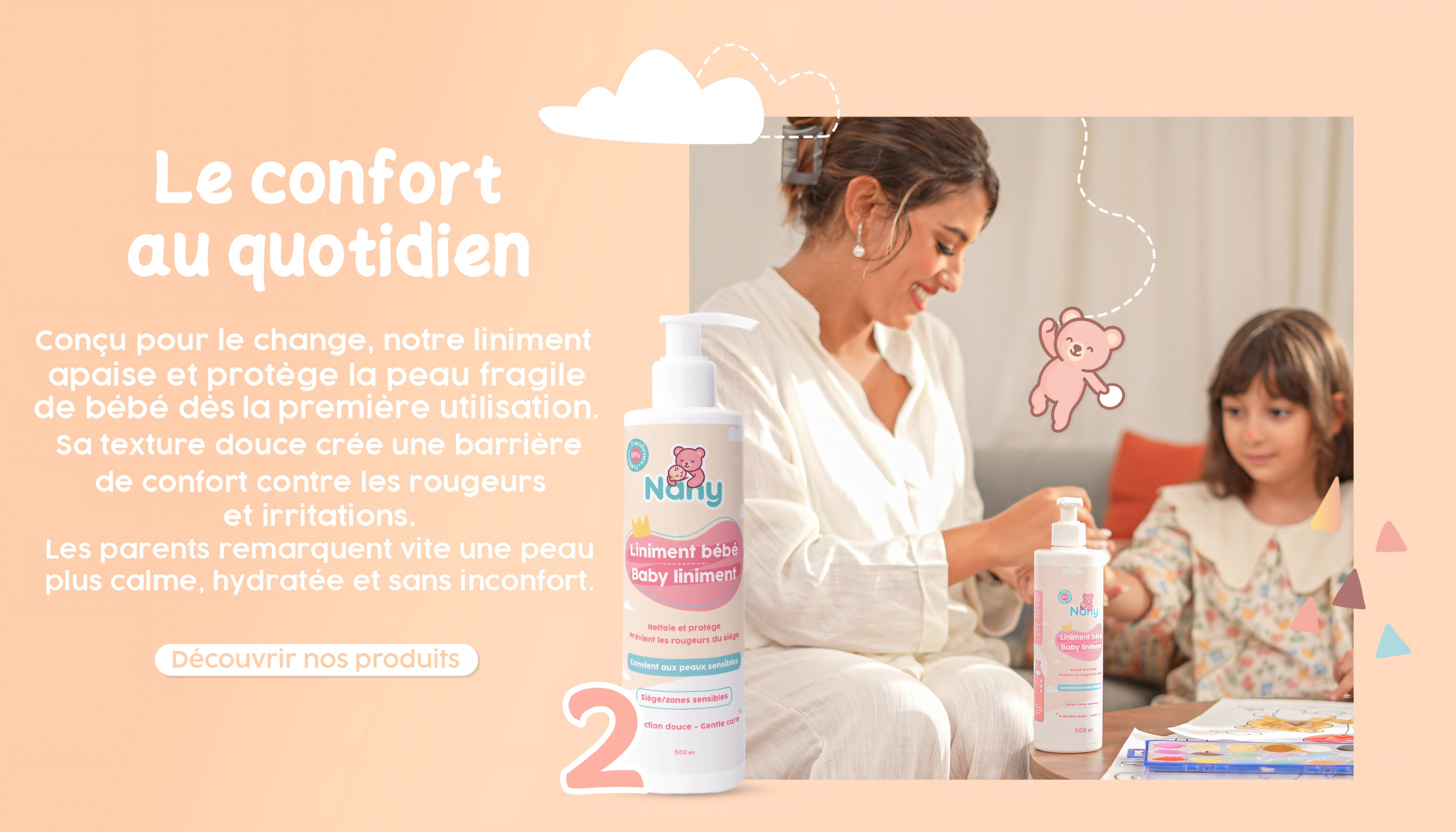 Chez NANY, chaque formule est pensée comme une caresse pour la peau délicate de bébé. Nous croyons que la douceur est la meilleure protection, c’est pourquoi nos soins sont développés avec des ingrédients naturels, sûrs et testés pour accompagner les premiers instants de vie avec tendresse et confiance.