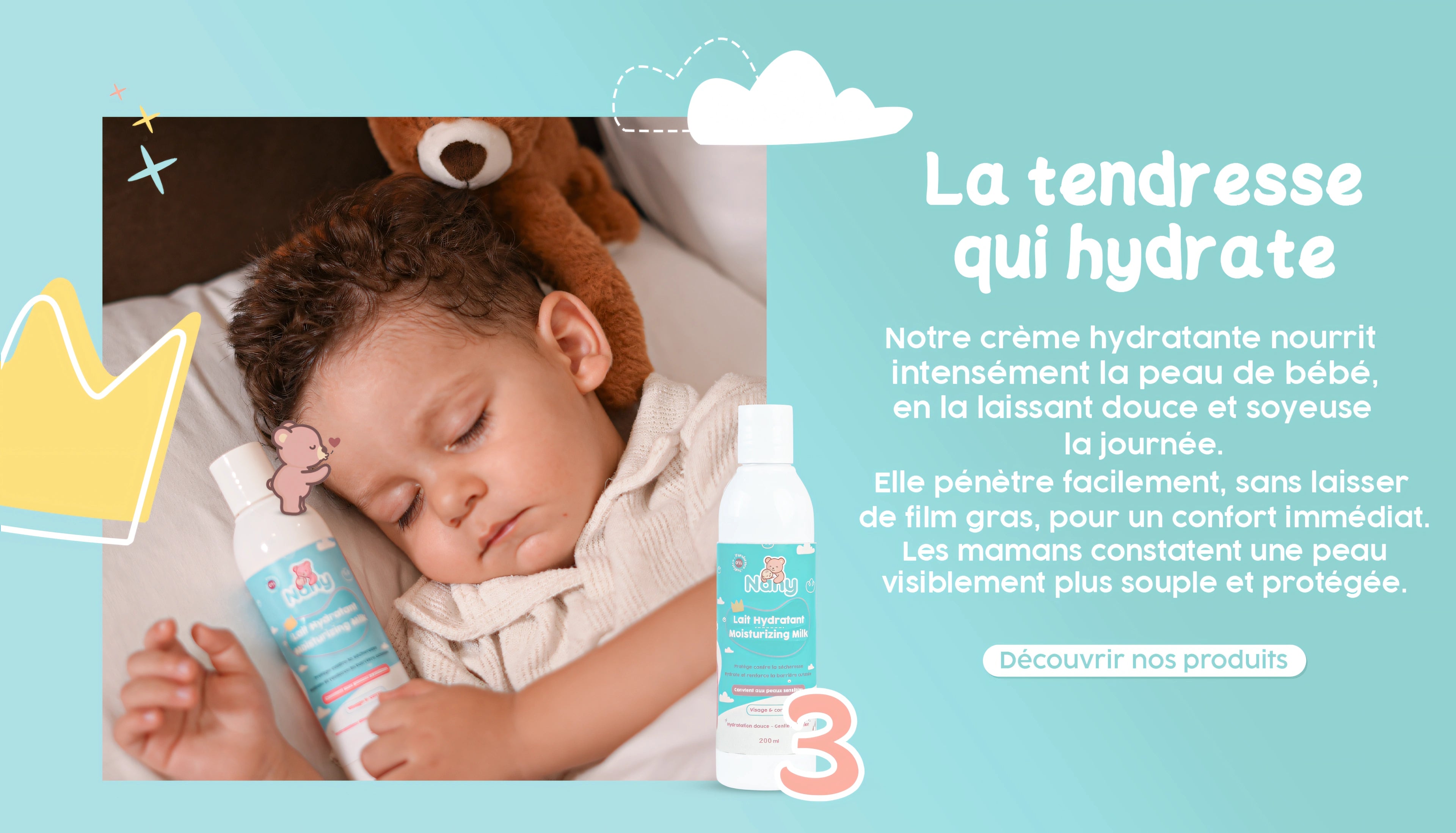 Déclarent que le lait hydratant NANY garde la peau de leur bébé souple et confortable toute la journée.